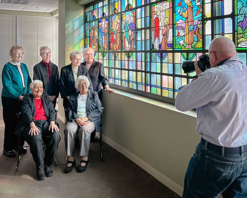 Above: Photographer Jim Judkis (right) captures Franciscan Sisters of Our Lady of Perpetual Help. Back row, from left: Sr. Corinne Struckhoff, Sr. Monica Laws, Sr. Madonna Jodlowski, Sr. Regina Strassburger. Front row, from left: Sr. Olivia Bellegante, Sr. Juanita Little.